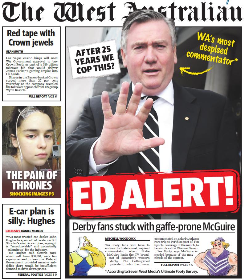 Meanwhile over here in Perth it’s Derby weekend, and The West Australian have cracked the sads over the fact that Eddie McGuire is coming over to Perth to call the game for Fox Footy.