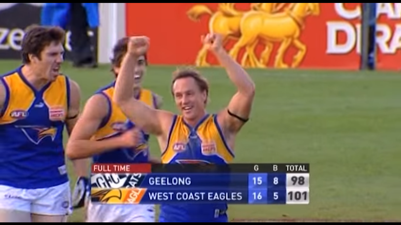 As for this somewhat storied rivalry, I would choose the 1992 Grand Final, just to remind everyone that Geelong are the club responsible for the Premiership Cup leaving Victoria for the first time, but instead, here’s the time Bomber Thompson ate a sandwich in the coaches box while the Cats demolished the Eagles in 2008 by 135 points.
