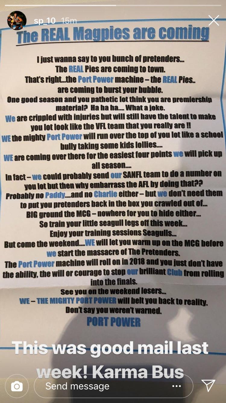 I wonder if the Alberton faithful will send another terrifying message to Pendles, warning Collingwood of the impending doom.