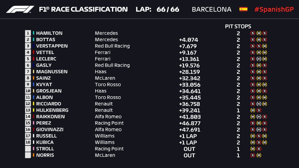 Ultimately, in what is a TL:DR of Formula One in 2019– Hamilton won (With the bonus point) from Bottas, allowing Mercedes to tie the record their fifth consecutive 1-2 finish, with Verstappen in 3rd, as the Ferraris once again got smashed on race strategy.