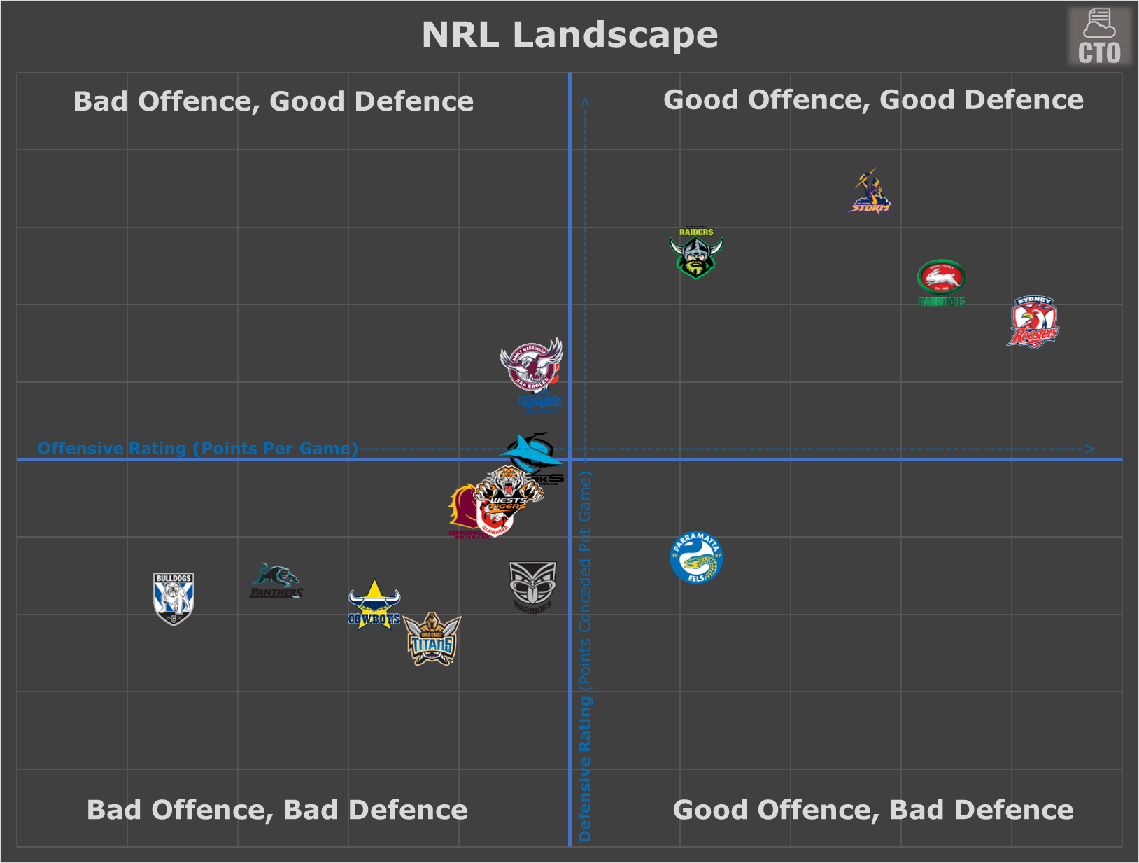 And lastly, these are the unofficial efficiency rankings up to Round 9, from /u/cookedcowboys on the NRL Reddit.