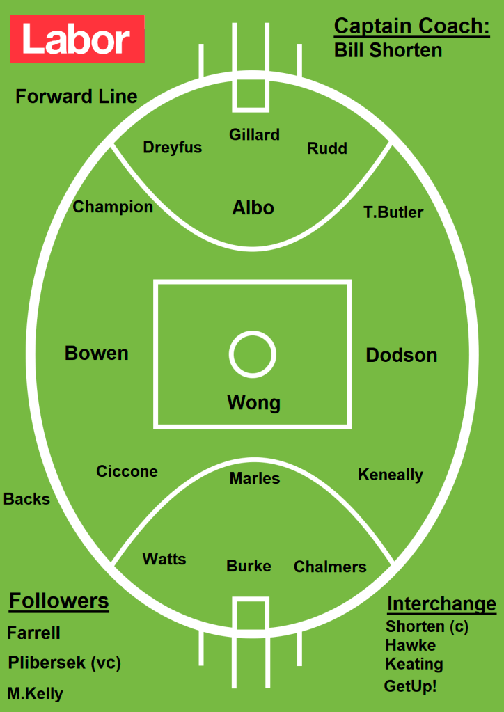 Shorten has also made an interesting move at Centre Half-Forward, naming the ever popular Graylander Galloper, Anthony Albanese, to add some physical and soundbite pressure on Tony Abbott and Peter Dutton.