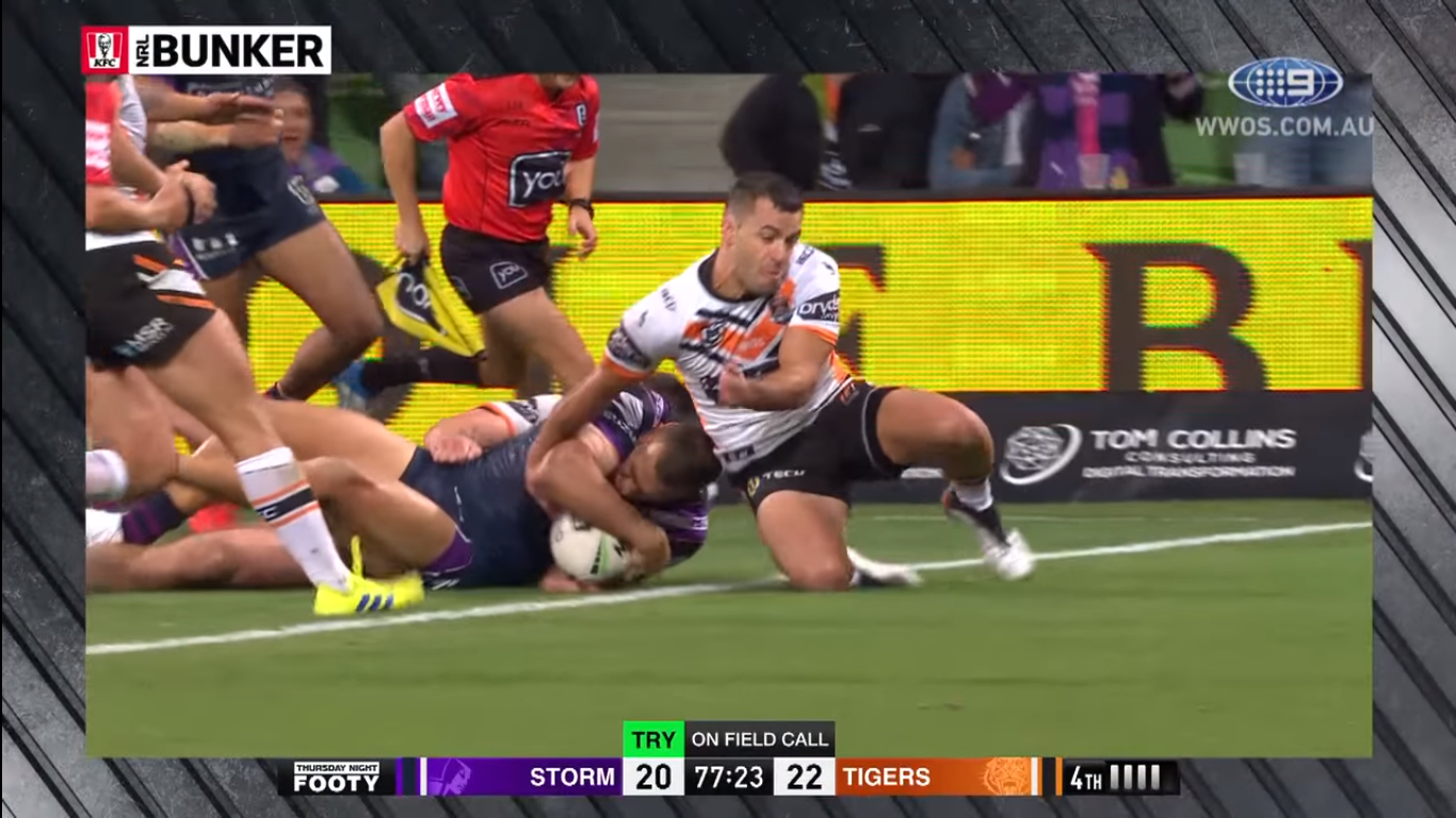 The Tigers swept the Storm last year, and for most of the night, they were right on track to make it three wins in a row, as every time the Storm attempted a comeback with a try they would always somehow knock it on during the set after the kick-off.