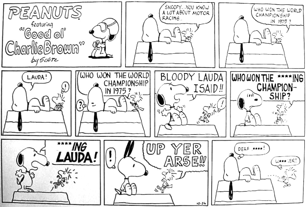 If it weren’t for surviving that afternoon at the Nurburgring in 1976, and if it weren’t for winning the F1 Drivers’ Championship three times, Niki would still be remembered for this Peanuts cartoon.