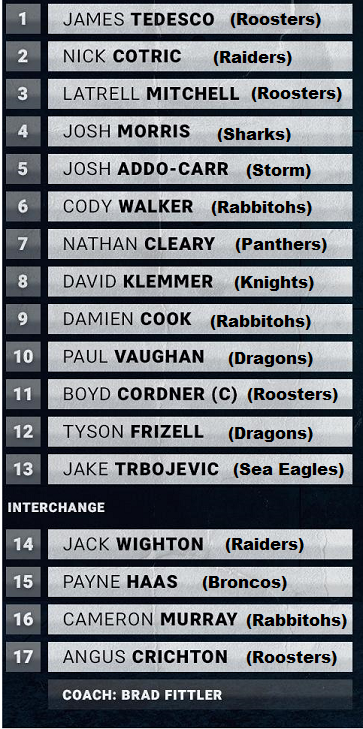 Anyway, it’s pretty much the same core that won the Blues the Shield last year- The likes of Tedesco, Latrell and Josh Addo-Carr, and the exact same dominant forward pack, starring Damien Cook and skippered again by Boyd Cordner, while the halves stocks have been hit hard by injuries and form, in particular the poorly timed groin injury to Mitchell Pearce, who had reeled off five consecutive MOTM performances for the Knights, and Luke Keary, who suffered another concussion in the same game for the Roosters.