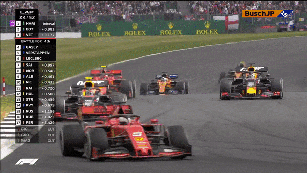 Later into the same lap, the epic Verstappen-LeClerc battle continued when the Ferrari got the inside line at Club and sent the Red Bull off the track in revenge for Austria, but Verstappen ultimately succeeded in keeping 5th, and later passed Gasly for 4th, and set off after Vettel.