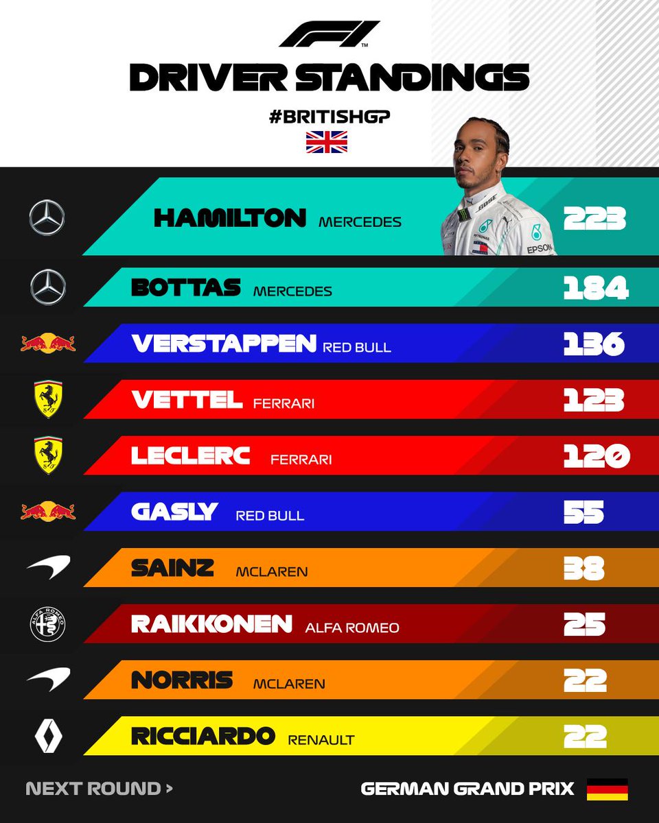 Out in front though, Hamilton charged home to win his record sixth British Grand Prix win, capping it off with a lap record on 32 lap old Hard tyres on the final lap, just proving how utterly dominant that Merc is, Bottas made it another Mercedes 1-2, LeClerc bagged another podium in 3rd, Gasly finally beat Verstappen in 2019 thanks to that accident, and Sainz, through sheer good fortune with the Safety Car, finished in 6th, holding off Dan for some 16 laps.