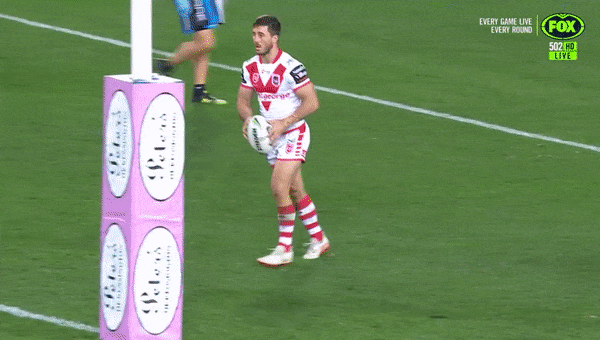 Saints were 14-2 down and looking utterly useless (As per usual) for an hour, and then thanks to some individually superb moments like Cam McInnes charging down what would’ve been the game sealing field goal for Adam Reynolds, then running a good 40 metres and recovering the ball, which a mere tackle later led to debutant Jason Saab scoring the try to put the Dragons right in the game- Gareth Widdop added the extras to tie the scores.