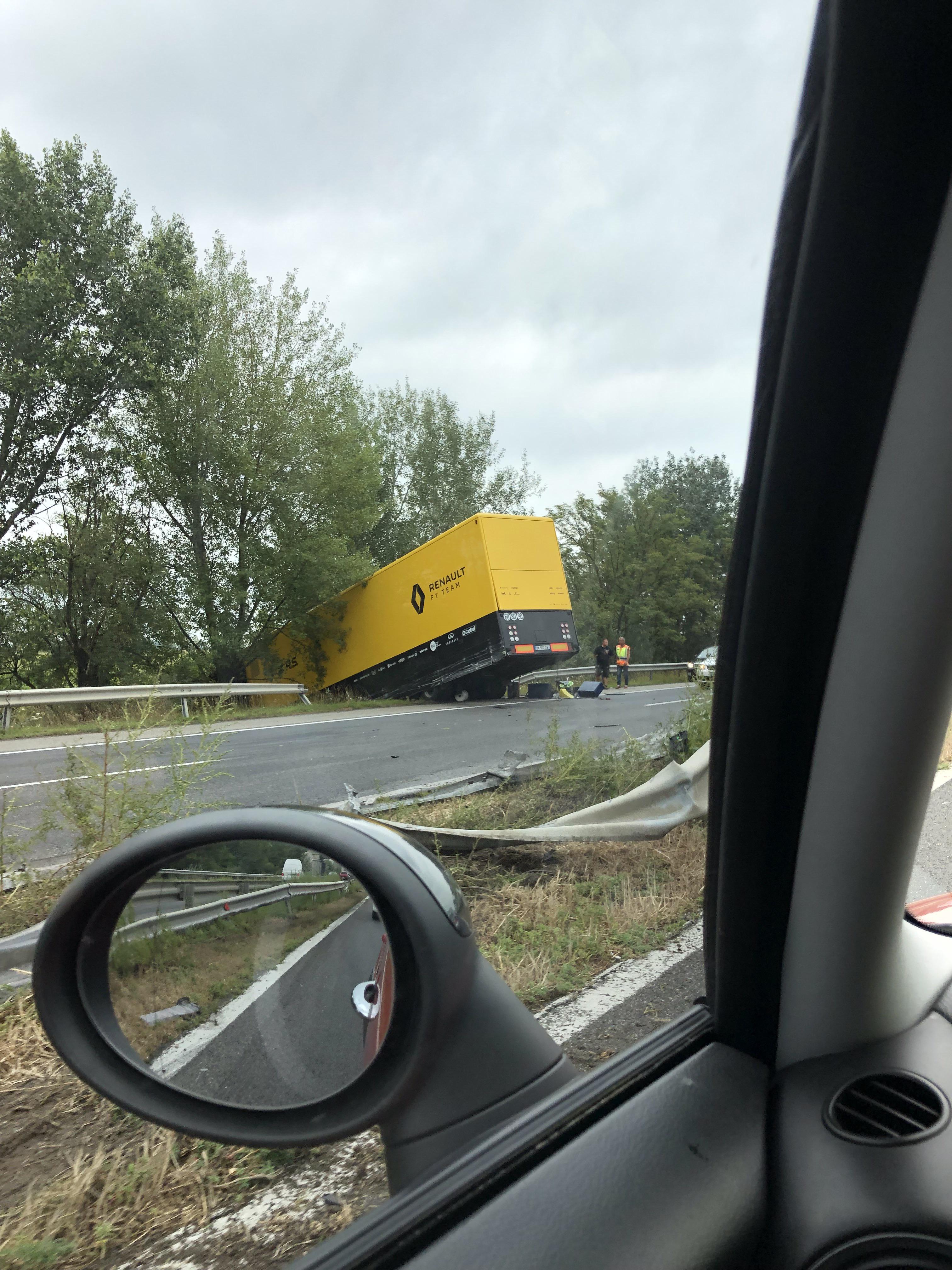 The Renault F1 Truck (Which didn’t have the cars in it) crashed on the highway to Budapest