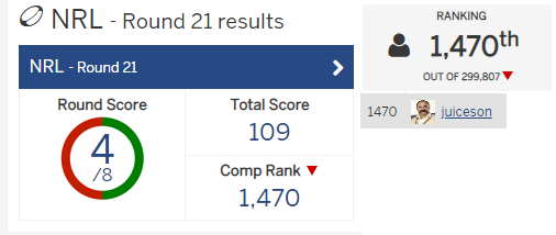 Anyway, my fluke of a time inside the Top 1000 on the FootyTips NRL tipping lasted as long as the Sharks’ premiership credentials- One week.