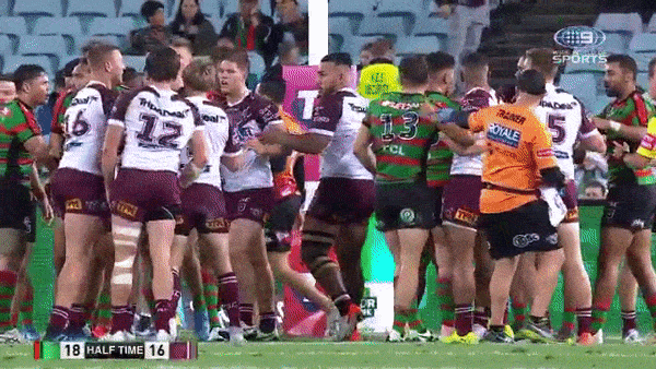 After Souths raced out to a 10-nil lead before being pegged back, the first binning came just on half an hour in, as a biffo took off on the Souths goal line, which resulted in Cody Walker being sin binned for slapping Jack Gosieski like he was a misbehaving toddler.