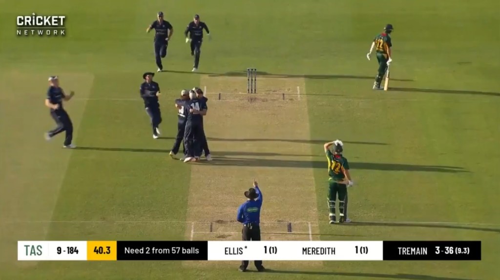On comes Chris Tremain, and Jackson Bird promptly edged one behind to Handscomb on the first ball of the over, then after squeaking a run to narrow it down to 2 runs required, Nathan Ellis was given LBW on a ball that swinging massively down leg side, sparking some utterly hilarious scenes.