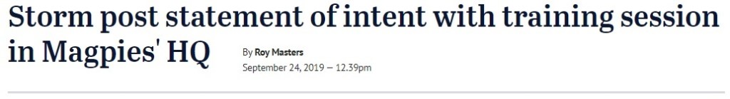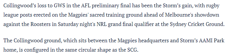In an effort to avoid the slaughter that the Roosters have inflicted on the other first-timers in 2019, the Stormers have taken advantage of Collingwood shitting the bed against GWS, and have stolen the Olympic Park Oval at the Holden Centre to acclimatise to the SCG’s dimensions, and to learn from the Pies about losing a close Prelim to a Sydney team.