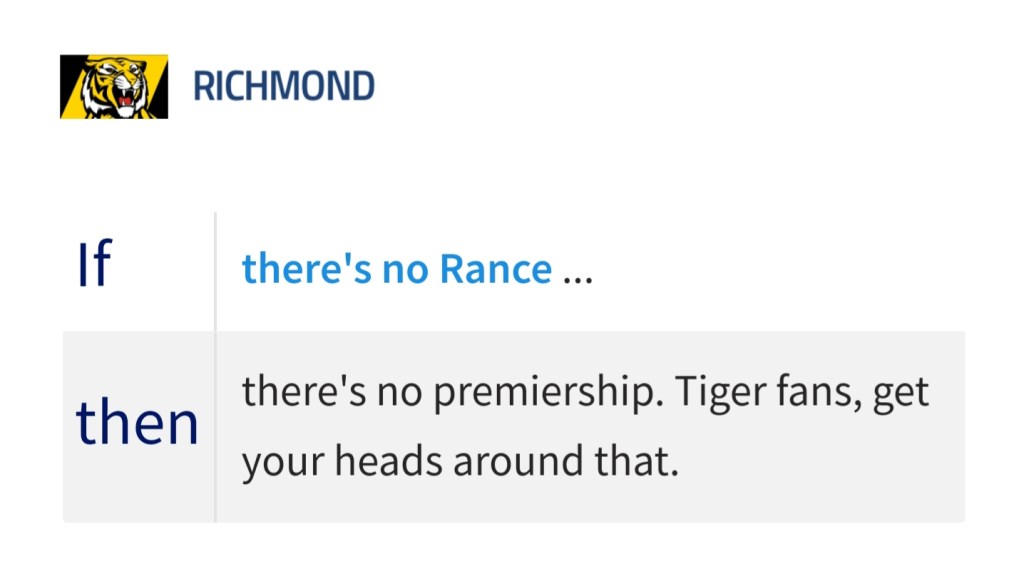 So the only two Grand Finals in history without a Top 2 team have been won in absolute smackings by Richmond; 1980 by 81 points, and 2019 by a lazy 89 points.