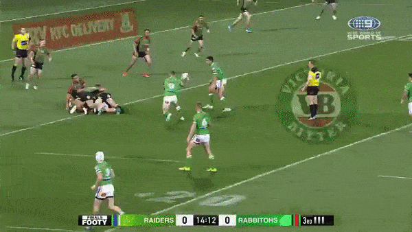 Reynolds made the play of the night with the intercept and streak into Raiders territory, which forced a desperate Charnze Nicoll-Klokstad to go for the desperate strip to slow him down after the tackle was done, and the referee had no hestitation sending him to the bin for a professional foul, leaving the Raiders playing with 12 for the final 10 minutes.