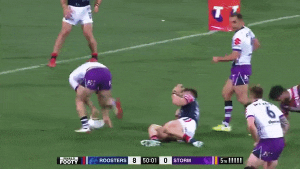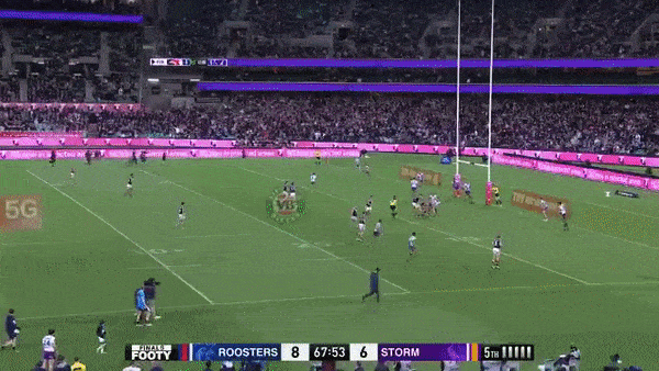 Example: Brett Morris completely misreads a bomb on the hour mark, leaving the Storm with 7 tackles inside the 10, starting with the Roosters somehow holding out Kenny Bromwich, and then ending with Smith putting in a grubber on the 5th tackle, only for Morris to have it covered.