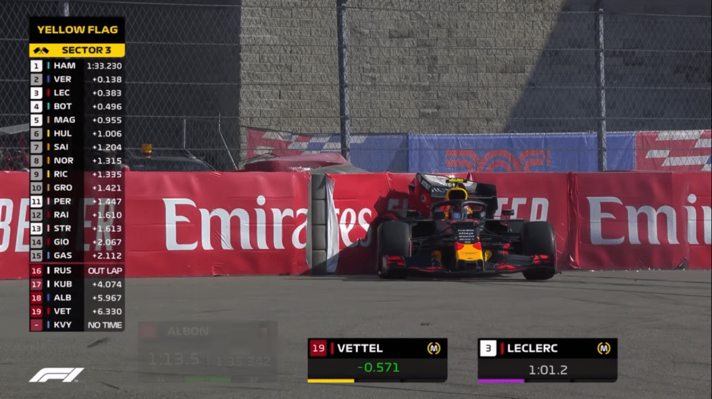 As if Vettel’s retirement wasn’t weird enough, a few short moments later, as the VSC ended, George Russell suffered a brake failure and went into the barrier at Turn 8, bringing out the physical Safety Car, and Williams decided to play it safe and end Kubica’s race, apparently to save parts… Even though he was perfectly fine to keep plodding along.