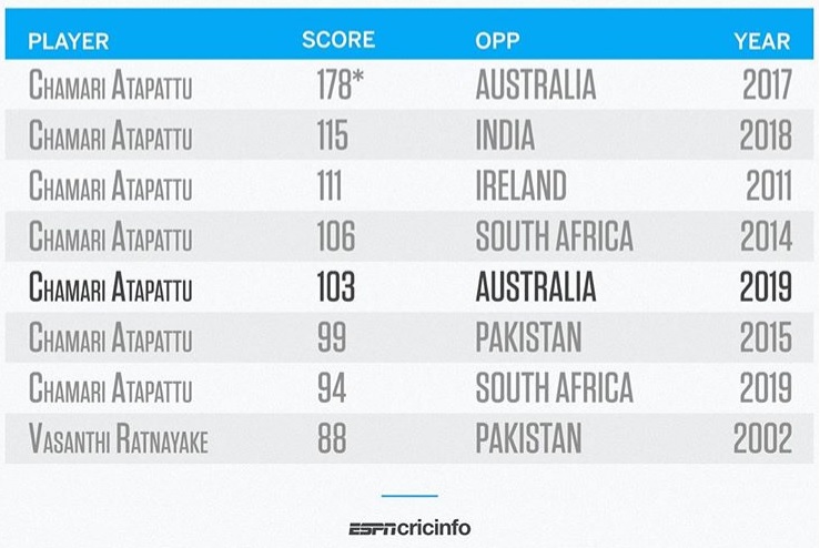 As the wickets kept tumbling, Athapaththu stayed alive long enough thanks to support from Kanchana and Ranasinghe (Who both got cleaned up by Schutt) to bring up her 5th ODI century, meaning that she now has the strange feat of recording the Top 7 Women’s ODI scores in Sri Lankan history.