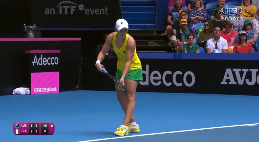 Kiki held for 4-4, and then after doing all that work, Barty appeared to seal her own fate by sending a forehand long, and then dumping a low backhand slice into the net, and it was 5-4, with France serving to bring up the upset!