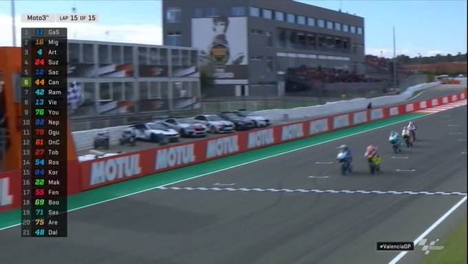 Ultimately, Garcia made a pass at the last corner and won the race by a flared nostril to Migno- Officialy 0.005 seconds- with Artigas in 3rd after passing Tatsuki Suzuki, also at Turn 14, capping off a superb result for the local fans in the lightweight class.