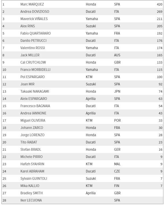 As for tyre choices, all of the top riders went for the medium front and a hard rear to survive the arduous 27 laps, except Petrucci and the Suzukis, who went for a medium front/soft rear combo.