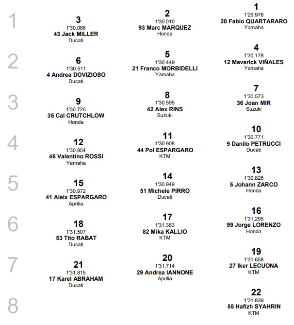 Quartararo had been fastest throughout practice, and he backed it up again with yet another pole position to cap off his wild success of a rookie season, being the only rider to put in a sub-90 second lap, with Marquez right alongside him in 2nd, barely a tenth away, and The Jackass returned to the front row in 3rd!