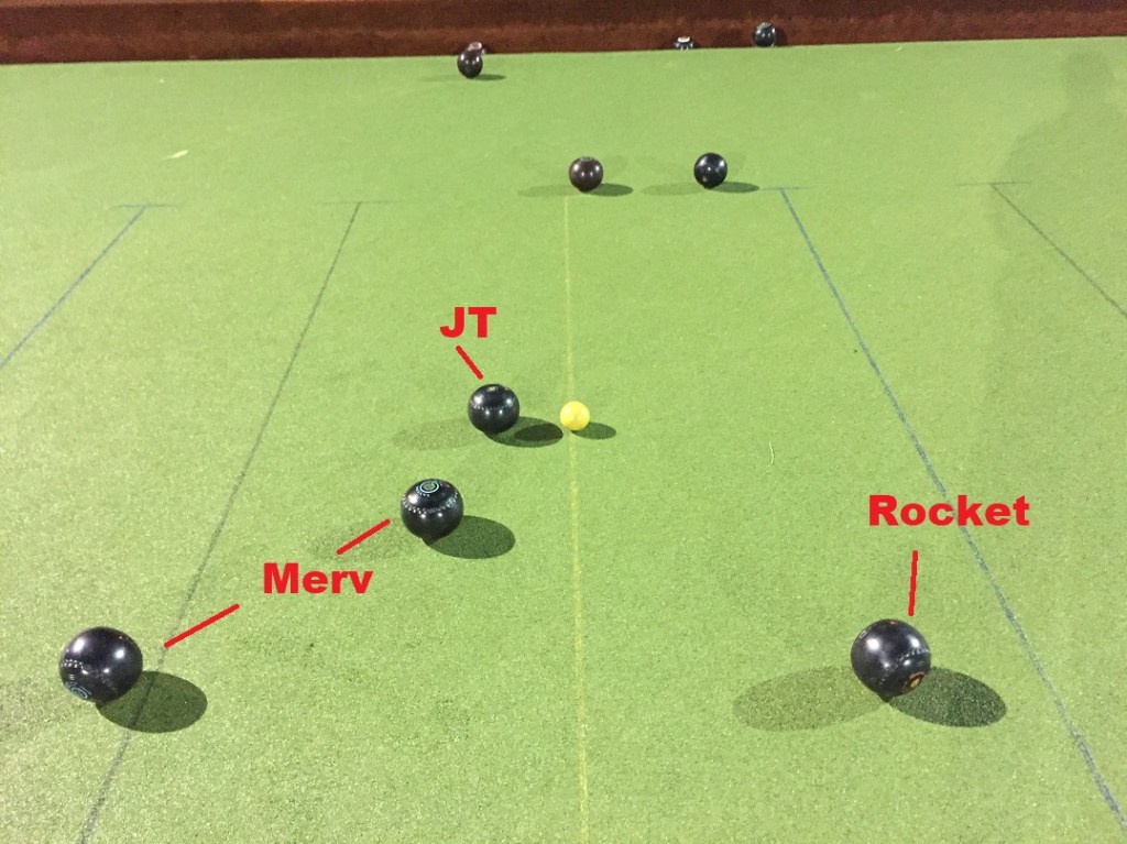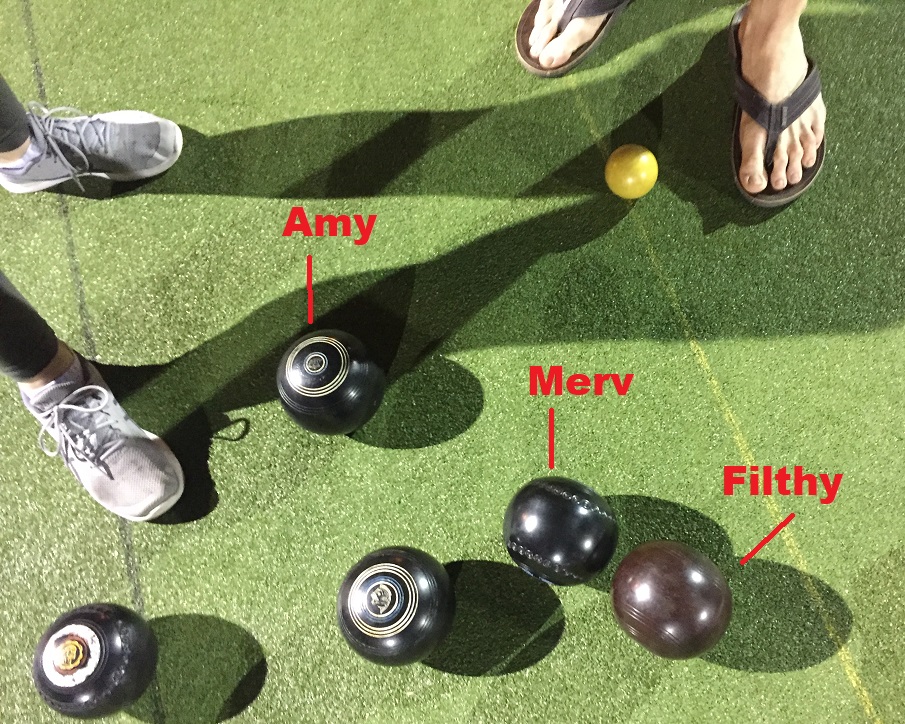 Bowling last, Filthy went for the time-honoured chaos tactics, firing down an absolute rocket with his last shot, which absolutely smashed into Presto’s shot (On the top left of the photo), and both bowls somehow missed the jack by a poofteenth, missed crushing my toes by a millisecond, and would settle well beyond everything, giving the No Hopers 2 shots to start the night.