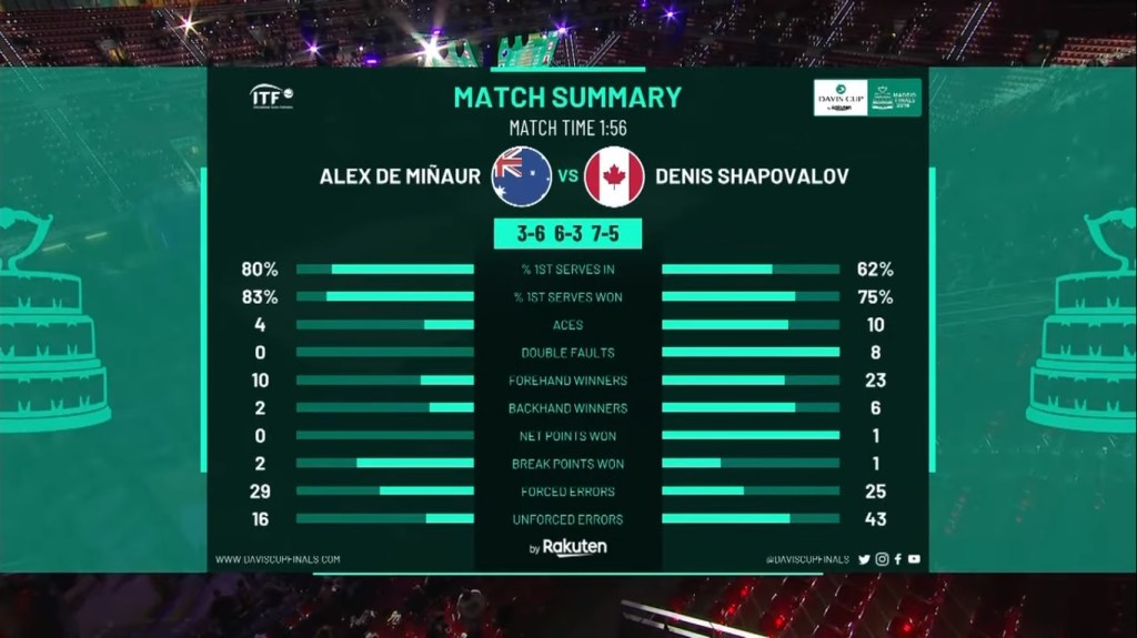 The Antipodeans had their backs to the wall, but a quick prayer to Satan allowed De Minaur to conjure up another massive performance, coming from a set down to defeat the fabled Canadian crimelord Denis ‘El Shapo’ Shapovalov 3-6 6-3 7-5, with Alex serving immaculately in that 3rd Set, only facing one break point (Which he saved).