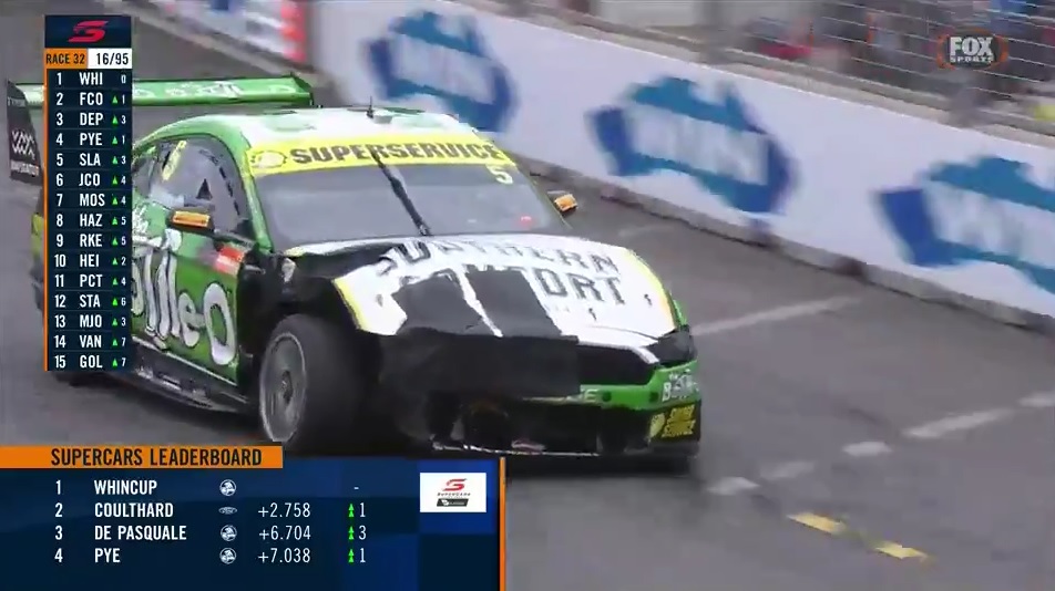 Gizzy continued his charge, passing Stanaway for 12th on Lap 20, but on Lap 24, the biggest incident of the race occurred when Anton De Pasquale emerged from the pits narrowly in front of a red hot Courtney, who got up the inside at Turn 2/3, but as they went downhill, the cars interlocked wheels, and De Pasquale was speared into the fence, destroying the steering on No.99, simultaneously causing a right rear puncture for No.22, and Anton would ultimately end up in the tyre wall outside the Surf Club.