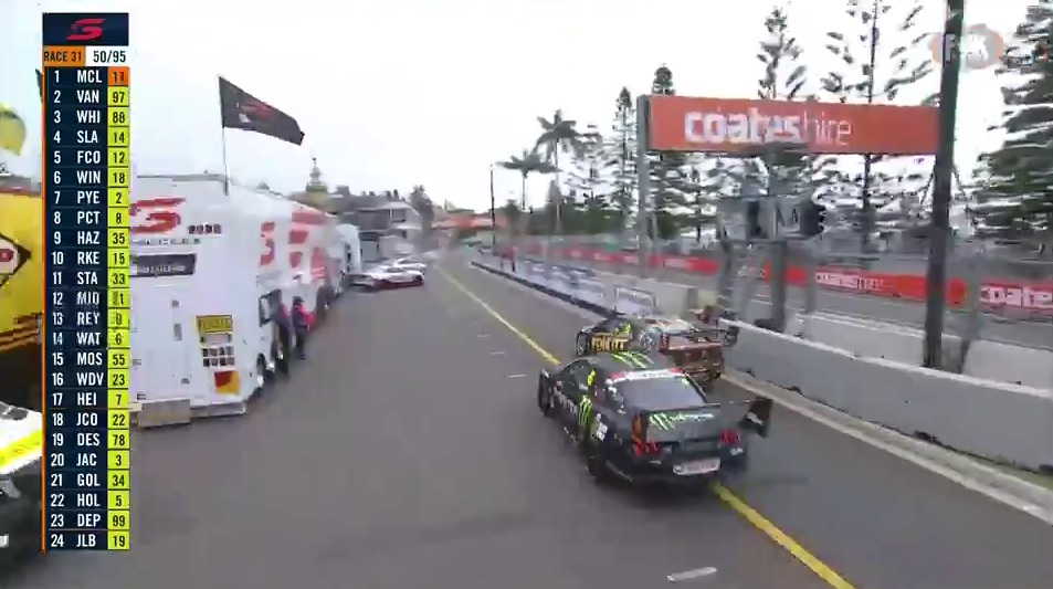 Given they had short filled, the SC worked out poorly for Waters and McLaughlin, who were due to take on 20 seconds of fuel, but now had next to no lead, throwing the advantage the way of Whincup and Coulthard.