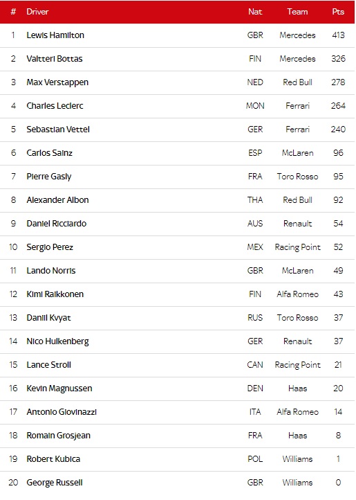 As the Mercedes and Red Bull crossed the line, all eyes were on the battle for the minors, with LeClerc beating off Bottas for 3rd, pending the stewards’ inquiry, but that had shit-all entertainment value on Perez claiming Norris for 7th on the last lap, and Sainz did pass Hulkenberg for the last point through Turns 12-13, as did Ricciardo, meaning both the Renaults finished outside the points, having really been screwed with the tyres they started the race on, but with Kvyat only claiming 2 points, the French outfit did hold on to 5th place in the Championship.