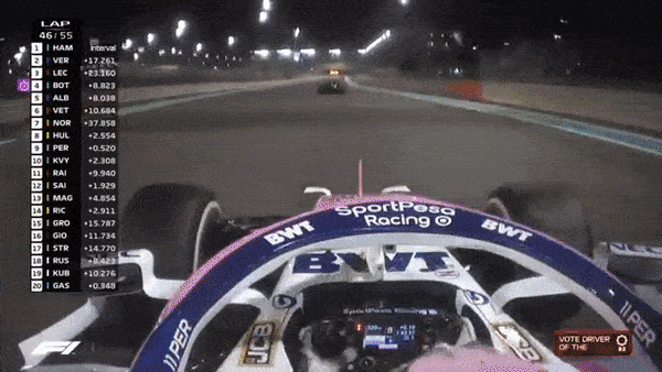 In the meantime, Perez had closed up to Albon to such a degree that he could smell the fear in Lando’s jockstrap, but at a track like Yas Marina, it’s one thing to close up to a car, and another to pass them.