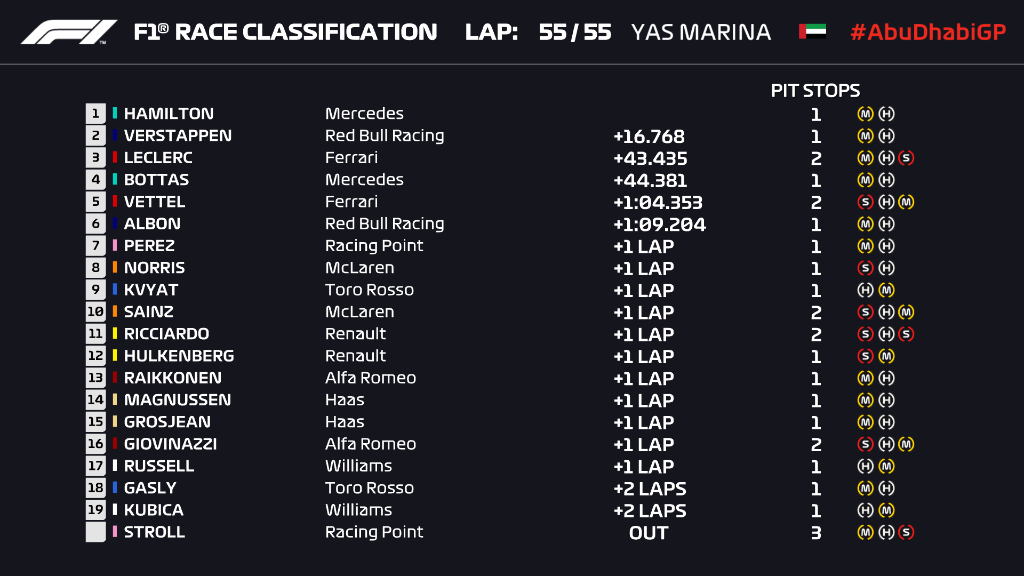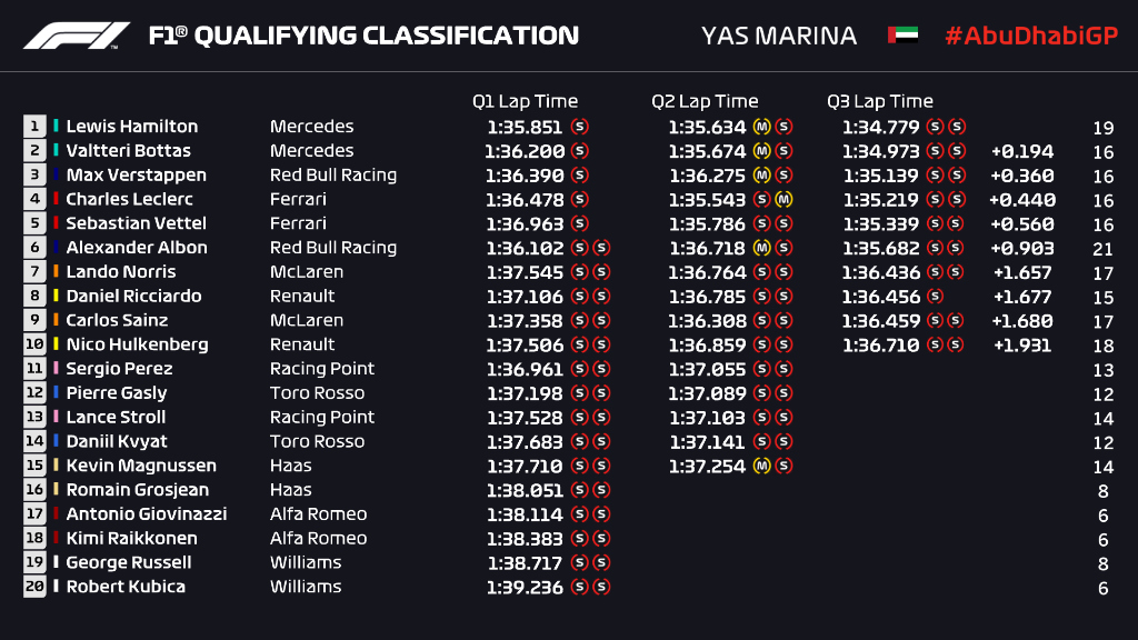 Led by Lewis Hamilton’s first pole since Germany, Mercedes secured another 1-2 in Abu Dhabi, which would only exist on paper with Bottas’ engine penalties, with Verstappen in a clear 3rd, while Ferrari managed to squeeze in another arse-up for 2019, holding off the final runs for both cars until it was too late, which resulted in LeClerc immediately behind Vettel being unable to set another flying lap, due to crossing the line after the session had timed out.