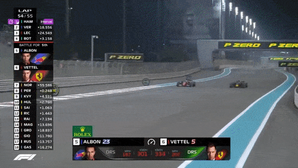 In the last 5 laps, Bottas was tearing chunks of out the deficit to LeClerc, while Vettel had caught up to Albon in 5th, first trying a pass down the outside of the first DRS zone, which nearly ended in tears when Albon braked very deep to retain the place.