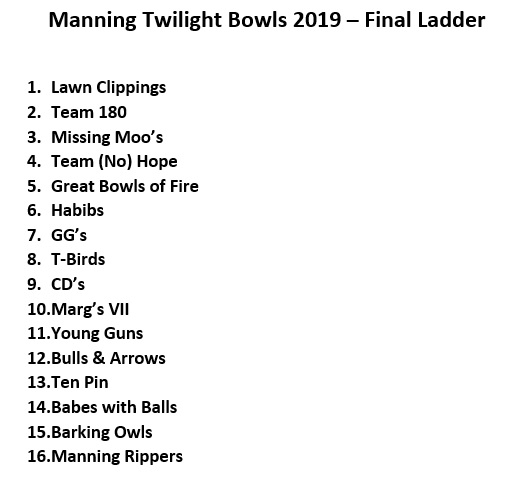 First up, the Grand Final between the Lawn Clippings and Team 180, and The Twilight Bowls Champions for 2019 – Who were undoubtedly the best performed team all season…