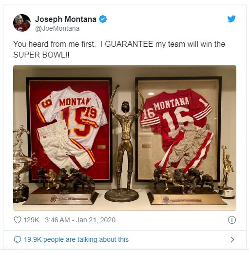 Some other funny facts include Kyle Shanahan joining his dad Mike (Coached the Broncos to wins in Super Bowls 32 & 33) as the first father & son to coach a Super Bowl team, and the other funny facet is the sheer number of Quarterbacks who have played for both teams – Bob Gagliano, Steve Bono, Elvis Grbac, Steve DeBerg, Alex Smith, and most famously of all, Joe Montana finished his career in KC, and defeated his protege Steve Young in their only ever meeting in 1994, the year of the Niners’ most recent title.