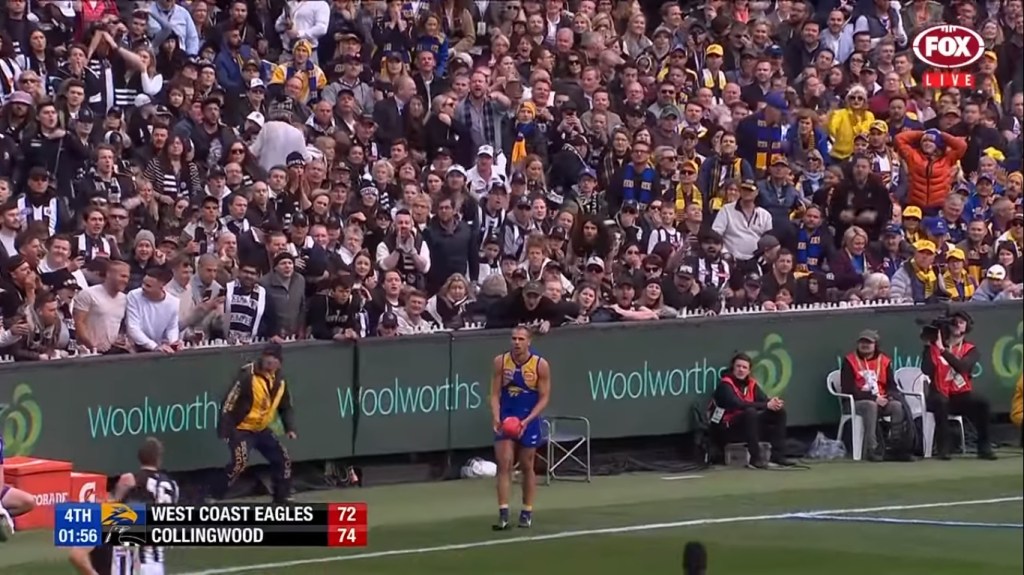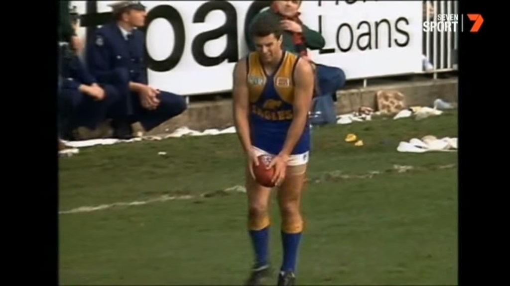 The last goal of the game was kicked by the Eagles player wearing No.4 (Peter Sumich) in the right-forward pocket at the Punt Road End.