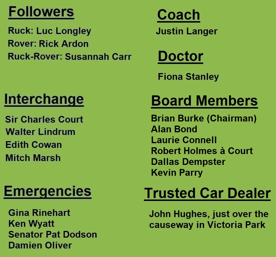 The first major inclusion on the bench is Sir Charles Court, beating out his son Richard to claim the token role of ‘Former State Premier’, and if you ask me, Sir Charles cost himself a starting position when he shut down the Fremantle train line in 1979, due to needing a freeway to get the Tanks from Swanbourne to the Rockingham naval base when the Soviets invaded.