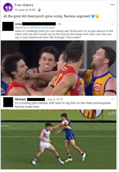 If Eagles fans weren’t already raging about the Gold Coast hub, then Jeremy McGovern’s suspension for an angry punch to Alex Sexton would’ve triggered their Vic Bias sense, especially with Silk Burgoyne’s sling tackle fine for an incident that could’ve ended very poorly.