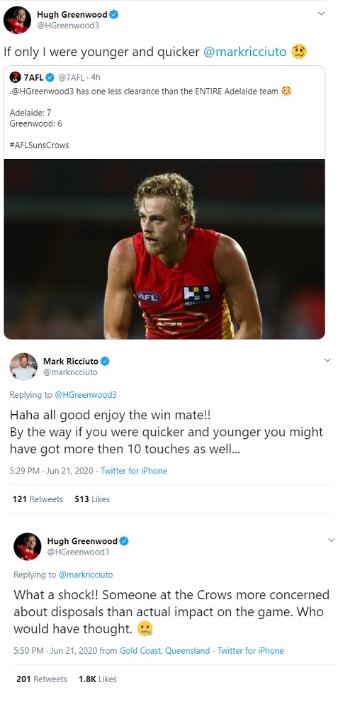 And, in light of Mark Ricciuto’s comments this week about several of the ex-Crows who have left the club – One of them being Sun Hugh Greenwood – Let’s enjoy Hughie’s Twitter conversation with Roo this evening, given he was traded for apparently being slow and not fitting their age profile.