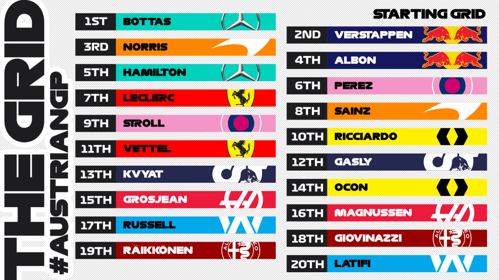 In the first Grand Prix in some 7 months, and the first season to start in Europe since 1966, Bottas got the best start from pole, Norris dared to take on Verstappen but had to settle for 3rd, while Hamilton fought with Albon, and almost came to grief with LeClerc, as the field was able to get away without a major incident – Ricciardo lost out to Vettel and settled in to 11th.
