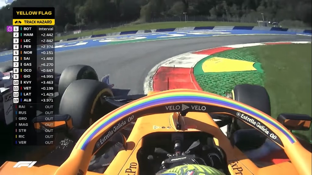 As for the other pushbikes, Max Verstappen qualified 3rd in his quest for a hat-trick of Austrian GPs, Lando Norris had his best-ever qualifying result for McLaren, both Racing Points (Alternatively called the Pink Mercedes) of Sergio Perez and Lance Stroll started in the Top 10, and the good news on ‘our’ side was that Danny Ric made it in to Q3, backing up the good pace that he’d shown in Friday practice, which predictably ended in disappointment after his only flying lap was wrecked by the Bottas yellow flag, leaving the Renault to start from 10th.