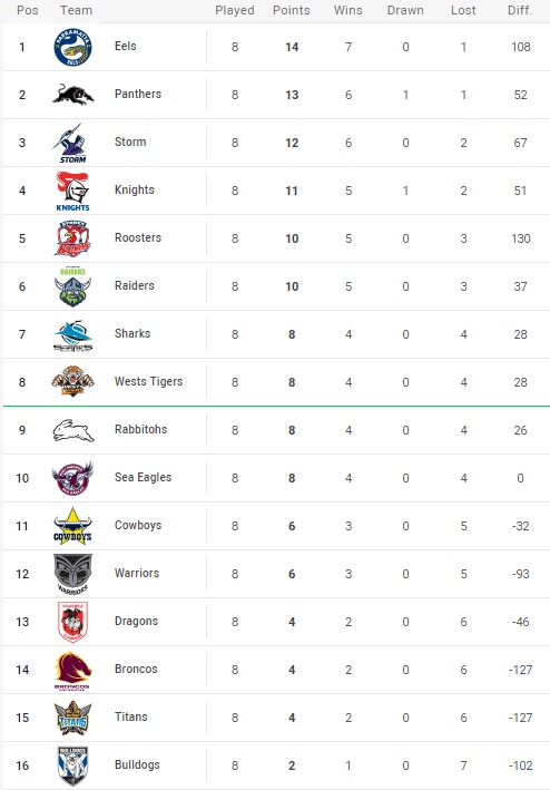 After weeks of facing a Murderer’s Row of opponents, the Eels are still leading the pack, and in a change of pace, they were given a live kill in the form of the Cowboys, and enjoying what would be termed in racing as a “Massive drop in class”, the Blue & Golds absolutely creamed them 42-4, as Maika Sivo once again terrorised a right edge defence for fun, running in 4 tries.