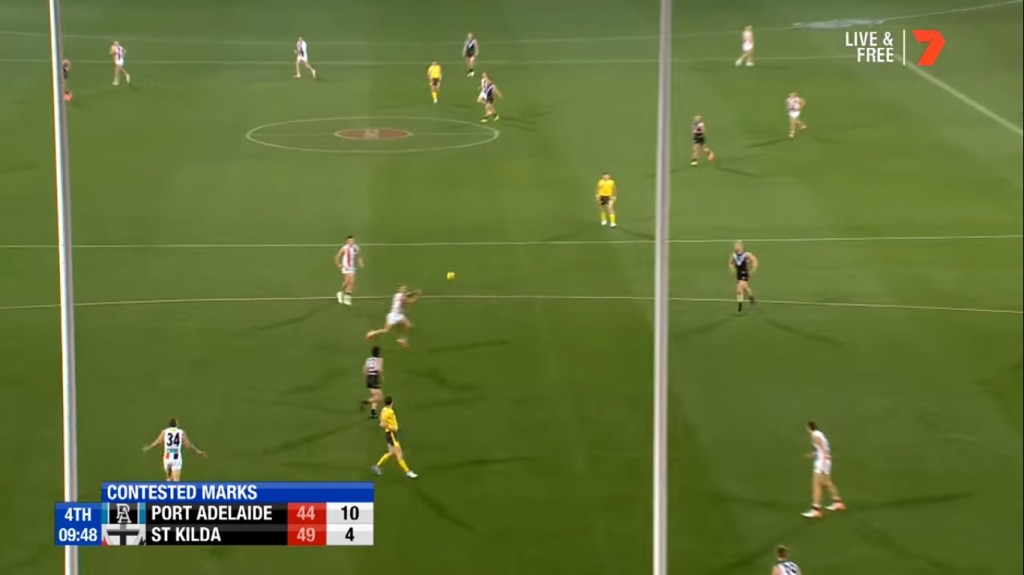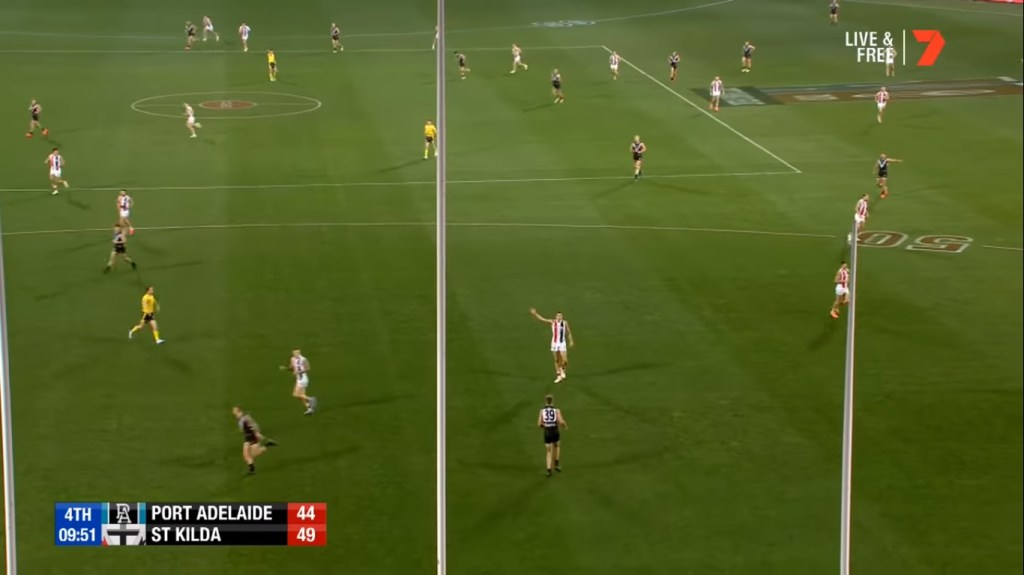 Dropped and given a reprieve when Trent McKenzie was injured, The Hoff took a very nice intercept mark in St Kilda’s 50, and he spotted up a target at half-back.