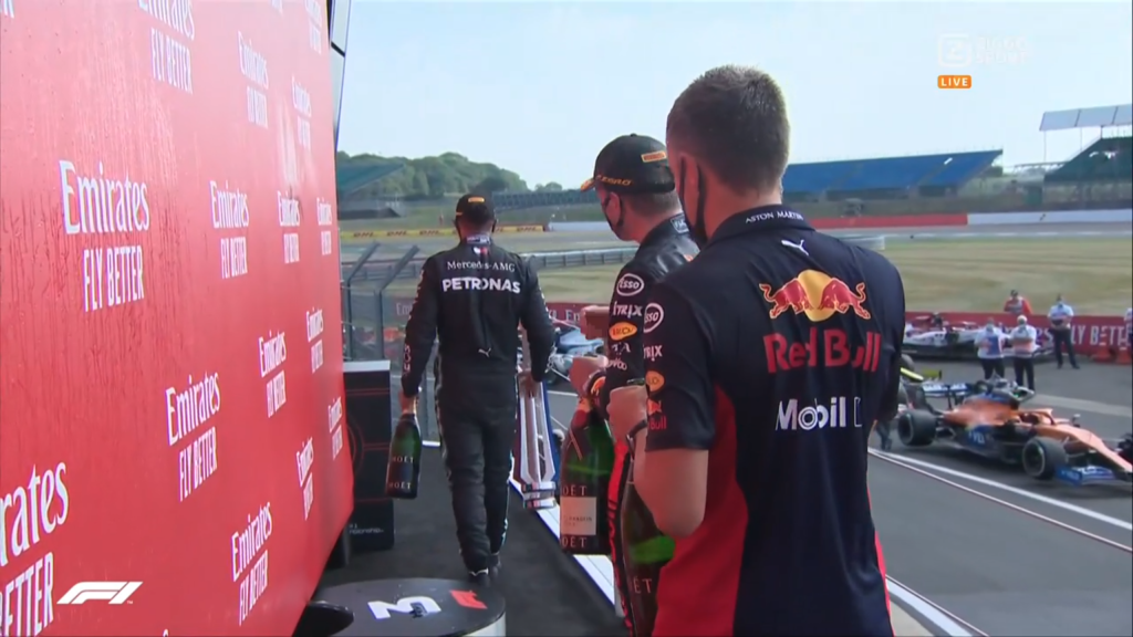 In another highlight post-race, Hamilton, obviously through muscle memory, walked off the podium with Verstappen’s winners trophy.