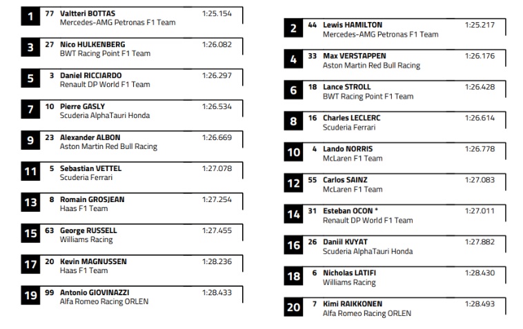 On the final runs, Hamilton bettered his own time, but Bottas got the last laugh this, grabbing pole position by 6 hundredths, as Hulkenberg’s massive return saw him start from 3rd, Verstappen grabbed 4th, while a bad middle sector cost Dan a second-row start, although he was a season-best 5th.