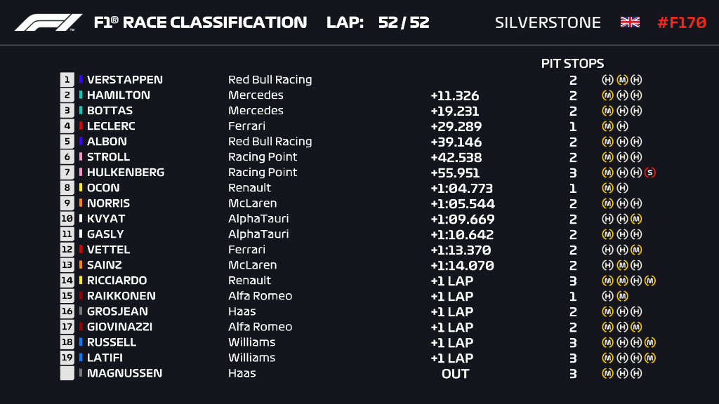 In a great strategic drive, a fully sanitised Verstappen whipped Mercedes by 10 seconds to win the only 70th Anniversary Grand Prix in history, the first time Mercedes had been beaten at Silverstone since 2012, as Hamilton equalled Michael Schumacher on 155 career podiums, and Bottas had been buggered by Mercedes strategy once again to finish 3rd from pole, and LeClerc eeked out another big result with that arse of a Ferrari, finishing 4th on a one-stop strategy.