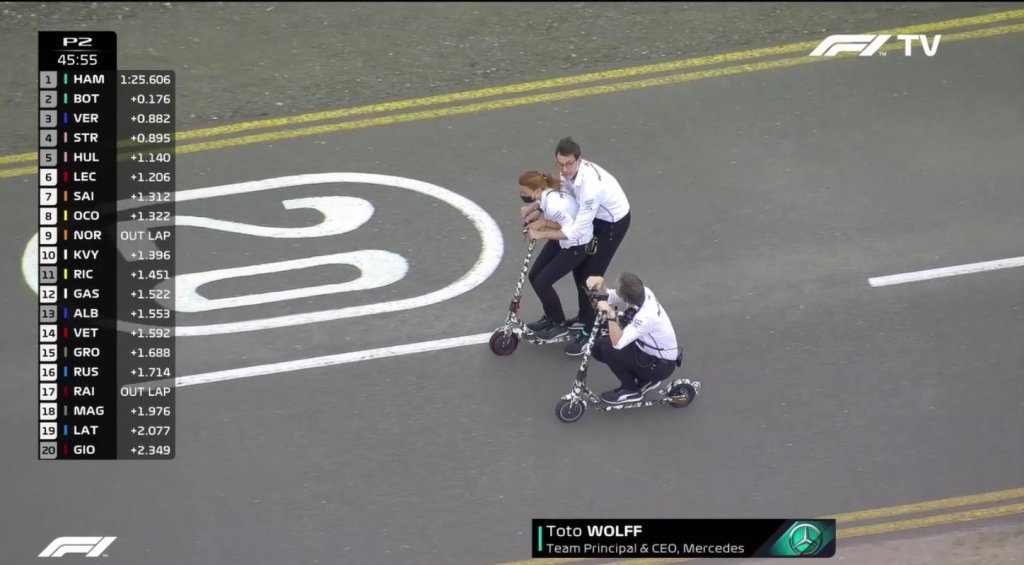 First Up – Toto Wolff and James Allison testing out a Mercedes electric scooter, with Toto in a very interesting position for a married man…