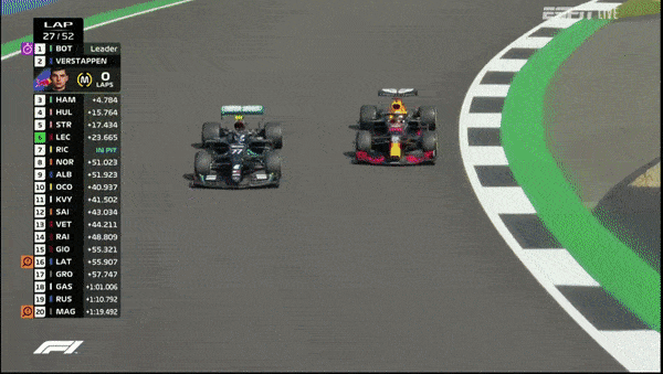 A lap later, Gasly was in for Alpha Tauri to make the same tyre change, emerging just ahead of Albon and covering the undercut, and back in front, Verstappen was putting himself in a good position, lapping at the same pace as the Mercedes and keeping the gap to Bottas within 3 seconds.