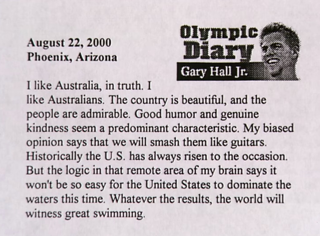 Another one of my random on this day moments – Saturday will mark 20 years since the ‘colourful’ American swimmer Gary Hall Jr, in a column largely praising Australia and the weirdos who live there, made a biased prediction about his compatriots smashing Australia’s swimmers “like guitars” at the upcoming Sydney Olympics, which was certainly picked up by the likes of Michael Klim and Ian Thorpe.